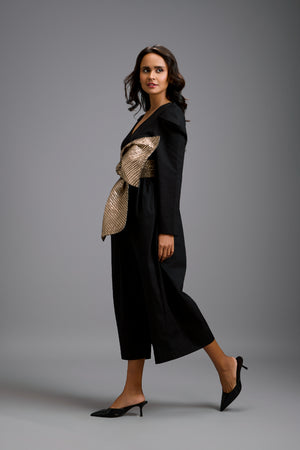Black Jumpsuit With A V-Neckline And Voluminous Shoulders, Cinched At The Waist By A Large, Textured Gold Bow