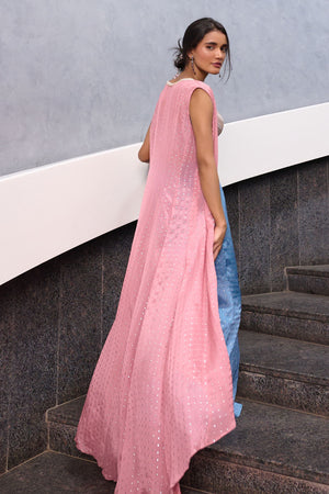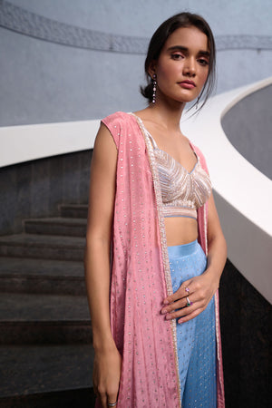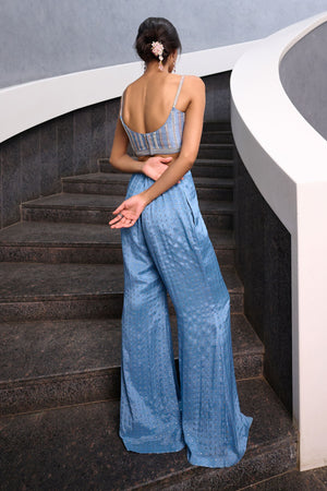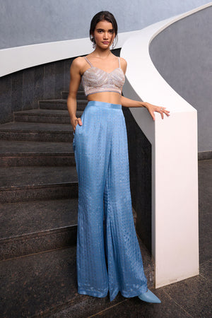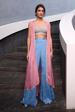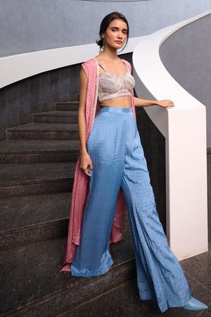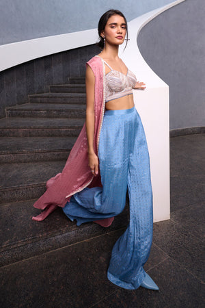 Blueish Grey Fit and Flare pant paired with blueish grey zardozi, pearl and glass beads embellished spaghetti bustier and mauve pink georgette jacket