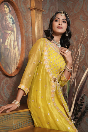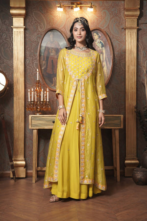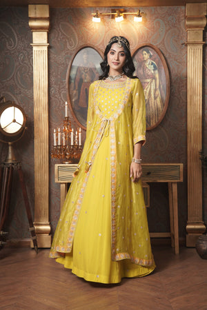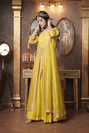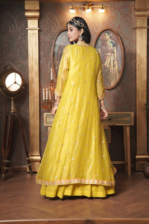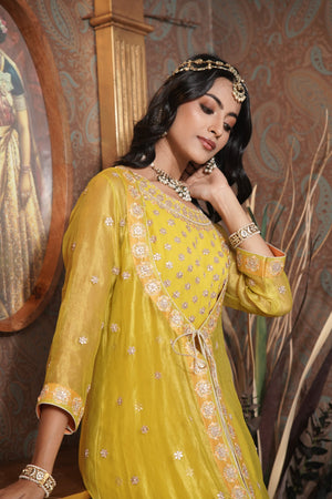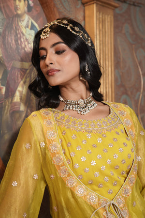 Introducing the Lime Sorbet Long Anarkali in georgette, a stunning fusion of tradition and elegance. This enchanting piece features intricate gota patti work that enhances its graceful silhouette. Paired with an angrakha-style jacket crafted from luxurious tissue fabric, adorned with exquisite hand-embroidered gota patti detailing and playful tassels, this ensemble creates a captivating layered effect. Perfect for special occasions, it radiates timeless charm and sophistication.