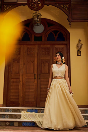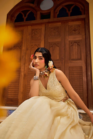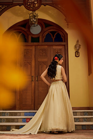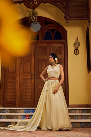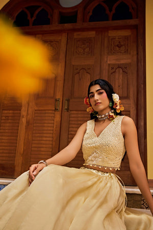 Radiate timeless beauty in our light yellow satin organza lehenga. Paired seamlessly with a halter neck chanderi blouse adorned with exquisite abla and bead embroidery. Complete the ensemble with an organza embroidered dupatta. Ideal for weddings, upscale events, and celebratory gatherings, this attire harmoniously merges traditional elegance with contemporary flair. Elevate your style with this opulent combination that captures attention and admiration effortlessly. Model Info: