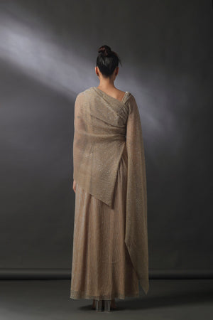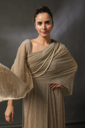 Look fine with dresses that shine. Seen here is a beautifully draped micro pleated gown in dull gold with a delicate pearl detail on the yoke.