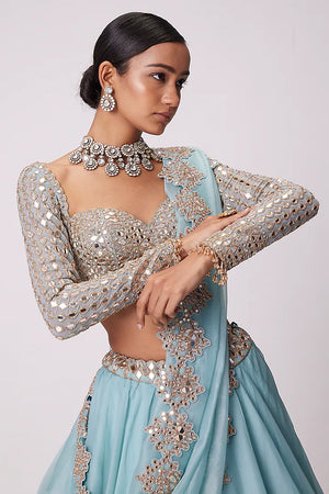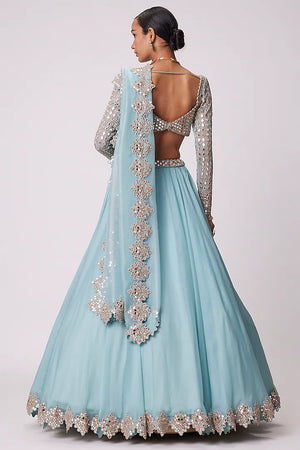 Powder Blue Organza Real Hand-Cut Mirror Embroidered Lehenga And Dupatta Clubbed With a Heavily Mirror embellished full sleeve blouse.