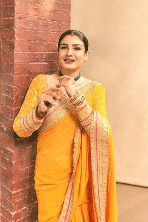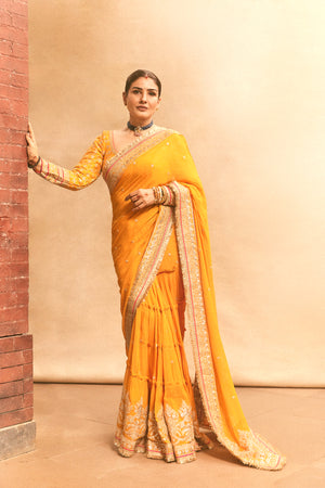 The saree features an intricately embroidered border. The gracefully pleated drape flows into a richly adorned hemline adding grandeur to the ensemble. Paired with a matching full-sleeved blouse showcasing all-over embroidery this saree strikes the perfect balance between traditional artistry and contemporary elegance.