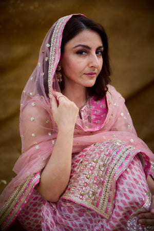The sleeveless kurta features a straight, elongated silhouette adorned with delicate embroidery along the neckline and hem. Paired with a wide-flared sharara pant in a coordinating print, the set is balanced with an airy dupatta accentuated by scattered work and embroidered borders