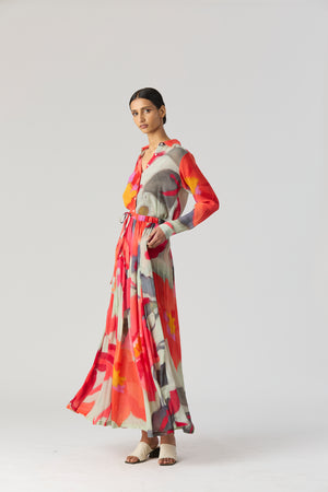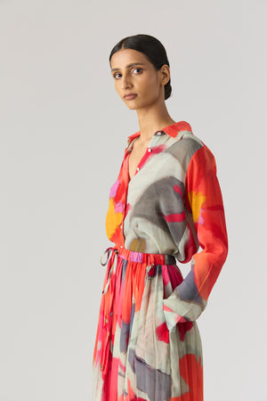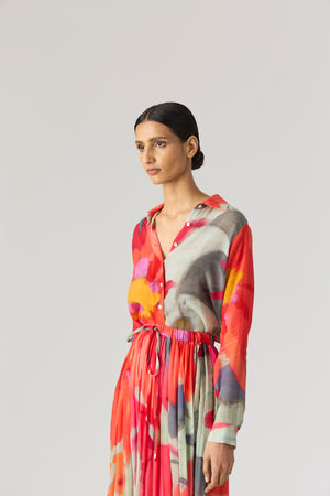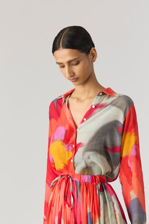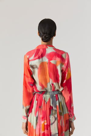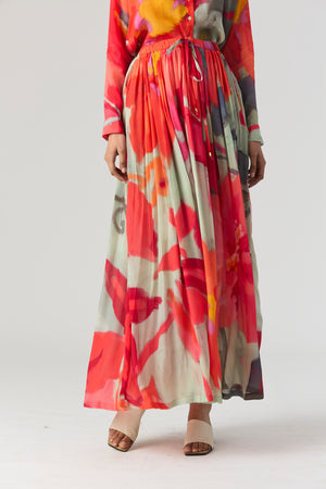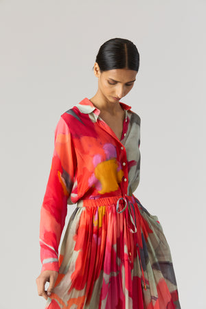 The Shirt and Skirt is adorned with a Clara print, featuring a lush green-toned base complemented by hand-painted flowers in shades of red and pink. Each delicate bloom is meticulously crafted, adding a touch of elegance and charm to this shirt and skirt.