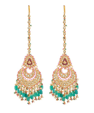 Thappa jadai chaandbali earrings with green stone hangings and kundun kaanchain.