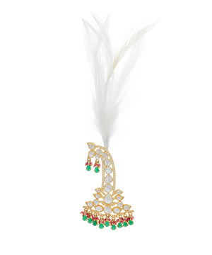 Open polki Kalgi with green stone hangings and white feather on top.