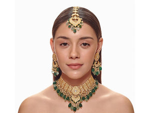 Peacock thappa jadai choker set with light and dark green stones. Comes with a pair of earrings and tikka