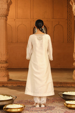 The Akira ensemble is made in pure chanderi silk fabric. The outfit is adorned with Kashmiri tilla and parsi gara embroidery highlighted with basra moti. The long kaaftan is having a broad and deep V neckline at front, a zero back, three-quarter sleeves with pockets at side . The outfit comes with a dogri salwar. The whole outfit is finished with scallop detailing.