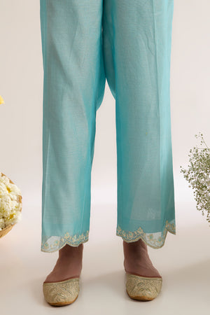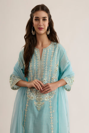 This beautiful A-line kurta AMANI is made from Chanderi fabric, it is teamed with Chanderi Plazo and sheer embroidered oragnza dupatta. This outfit features a classic neck design and has three quater sleeves
