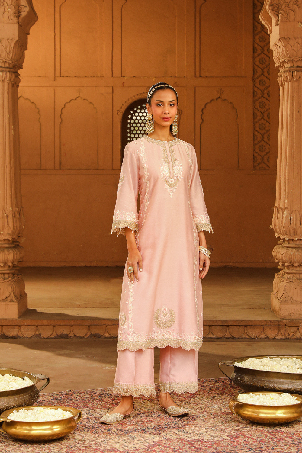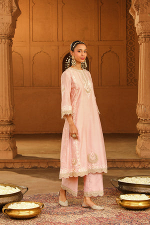 The long A-line ensemble is made in pure silk chanderi fabric teamed up with a palazzo and a silk organza dupatta. The outfit is having a zero neck with placket and three-quarter sleeves. The outfit is adorned with Kashmiri tilla and parsi gara embroidery highlighted with basra moti. The whole outfit is finished with scallop detailing.