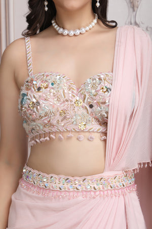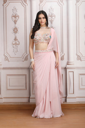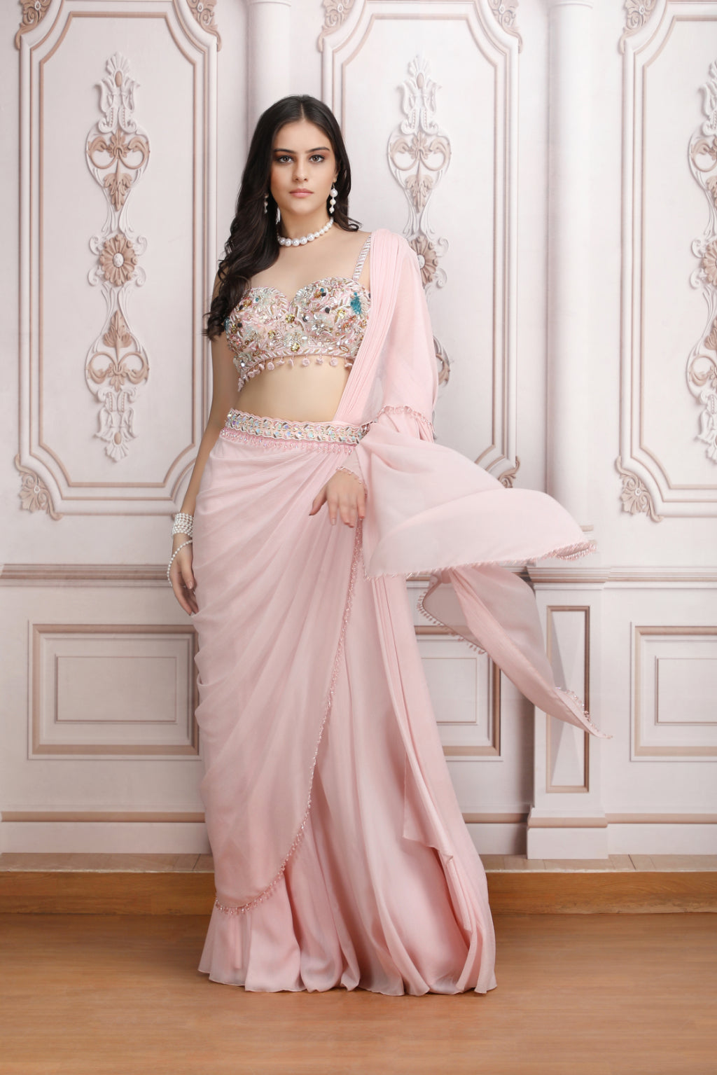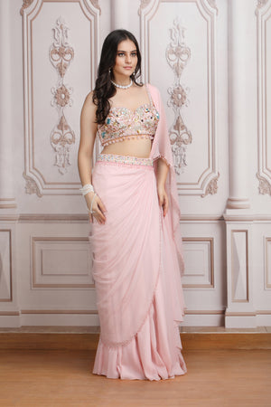Pastel pink pre-draped saree , featuring delicate pleats and a flowing silhouette. Paired with a hand-embroidered blouse adorned with intricate floral motifs in subtle tones, this ensemble beautifully blends tradition with modern charm.