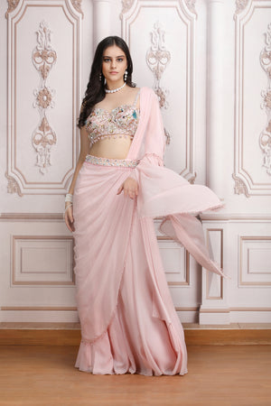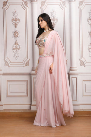 A Pastel Pink Drape Saree With A Hand Embroidered Blouse