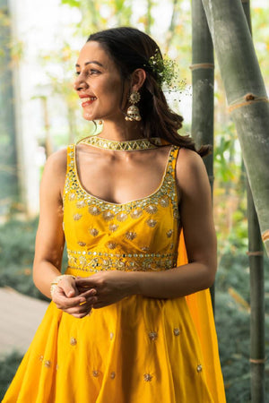 Yellow Silk Peplum Kurta paired with Silk Sharara Pants and Georgette Choker Dupatta.