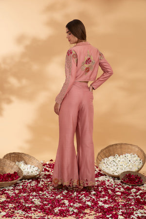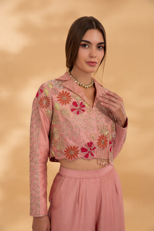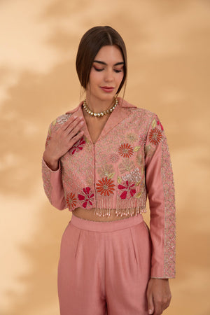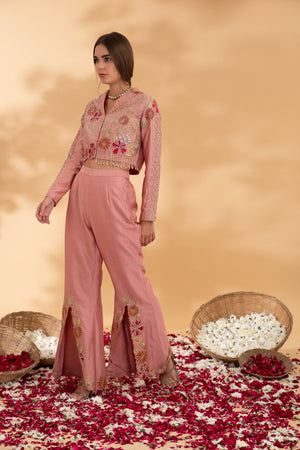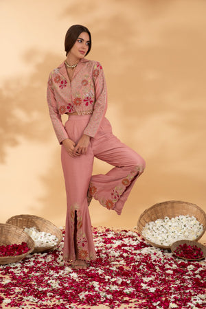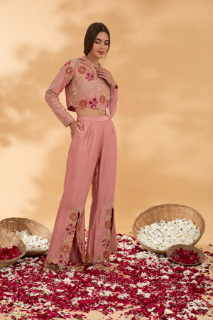 Featuring a dusty rose cropped jacket in chanderi with beautiful applique flowers and hand embroidery allover along with handmade tassles at the bottom of the jacket. Paired with matching pants with applique flowers and hand work along side trendy cutwork.