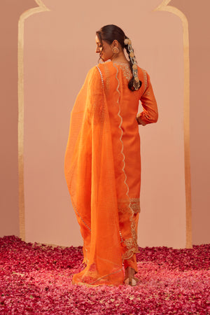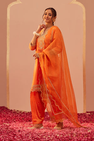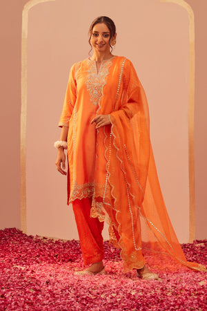 This ensemble is made in pure silk chanderi and a bamberg satin salwar teamed up with a silk organza dupatta. The kurta has a zero neck with a slit and three-quarter sleeves. The outfit is adorned with signature block print which is highlighted with tilla and patra embroidery. It is finished with a pure benarsi fabric and gota detailing.