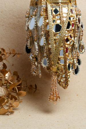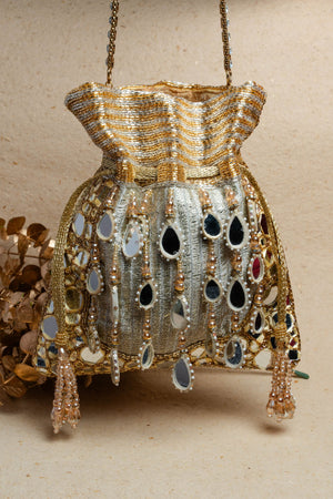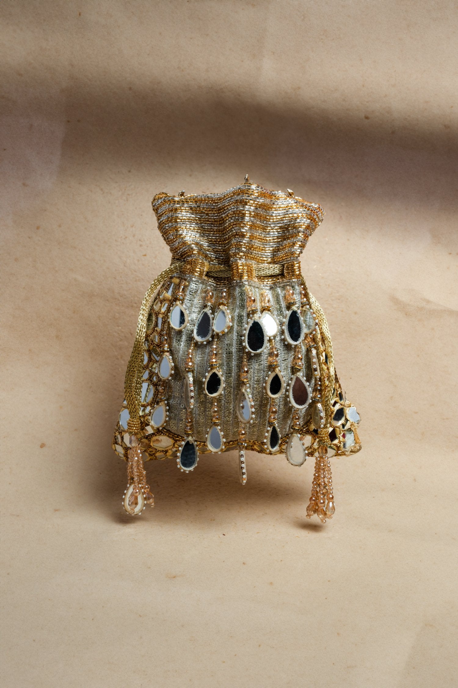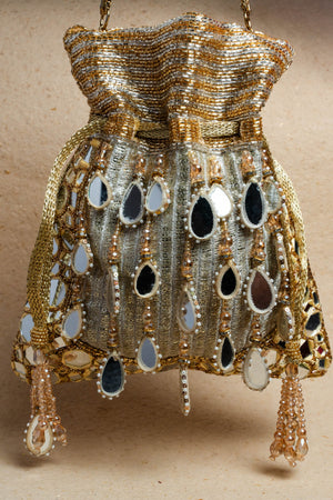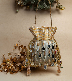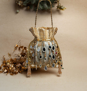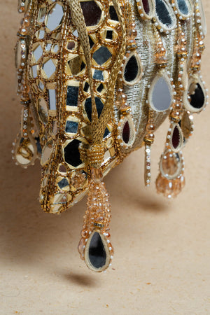 An exquisite fusion of tradition and elegance. This potli features a captivating mix of shimmering mirrors, delicate beads, and detailed abla work in a gold palette with a hint of silver. Accented with luxurious pearl finishing and playful tassels, this potli is designed to add a touch of sparkle and sophistication to any special occasion.