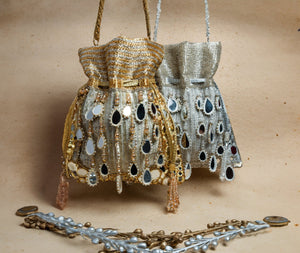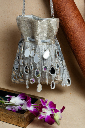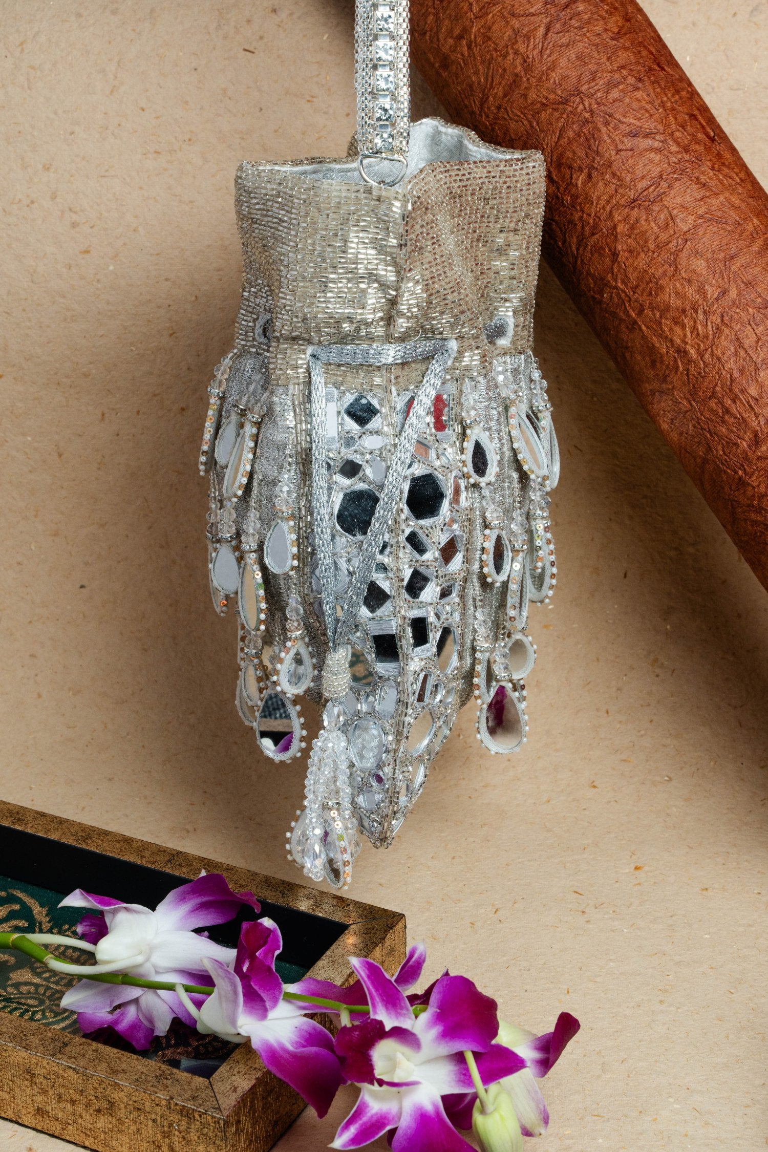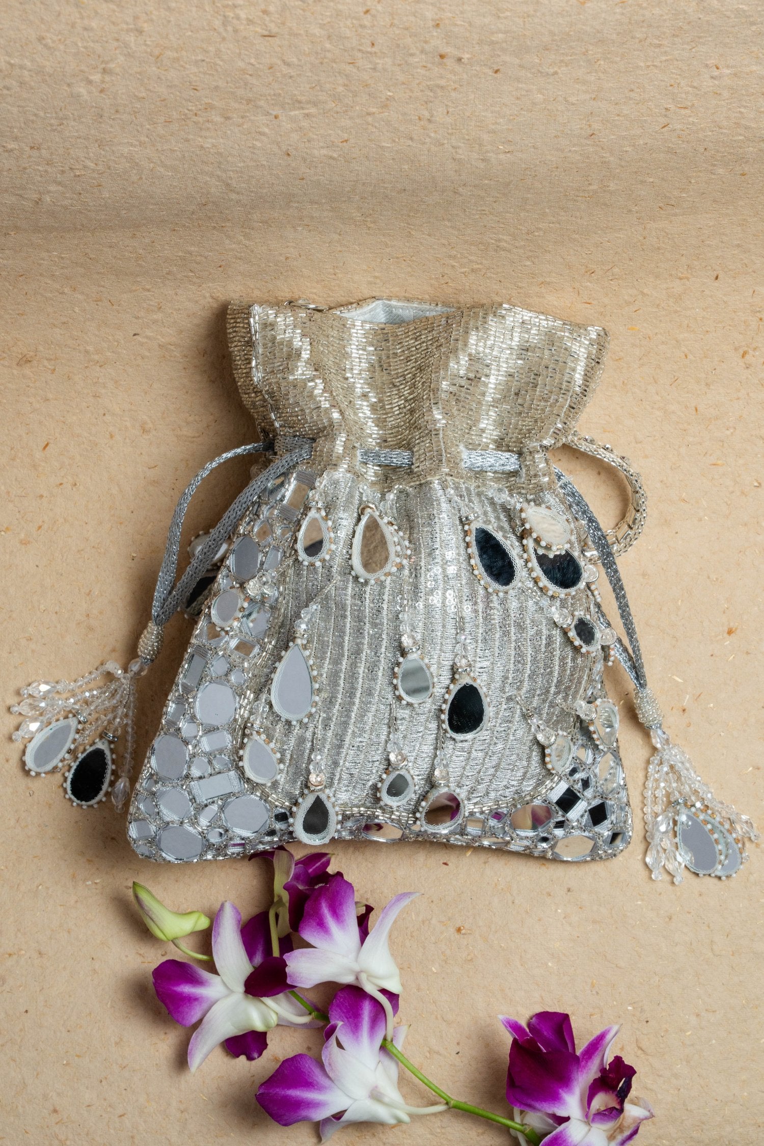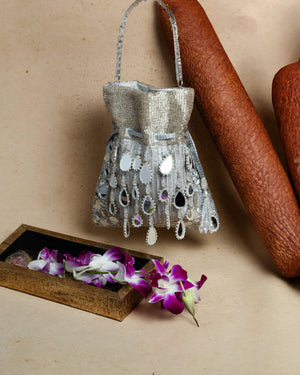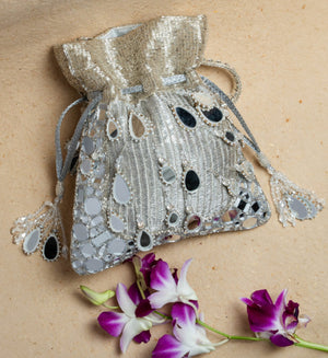 An exquisite fusion of tradition and elegance. This potli features a captivating mix of shimmering mirrors, delicate beads, and detailed abla work in a silver palette. Accented with luxurious pearl finishing and playful tassels, this potli is designed to add a touch of sparkle and sophistication to any special occasion.