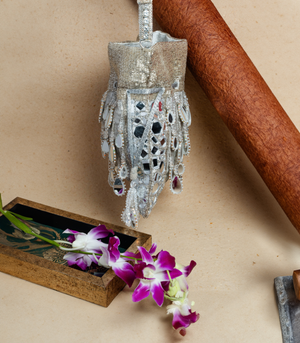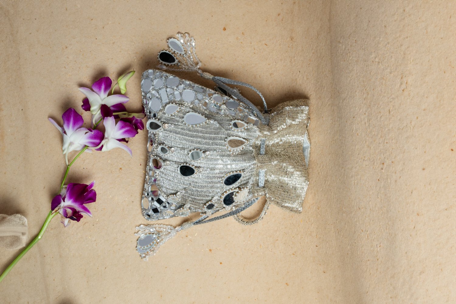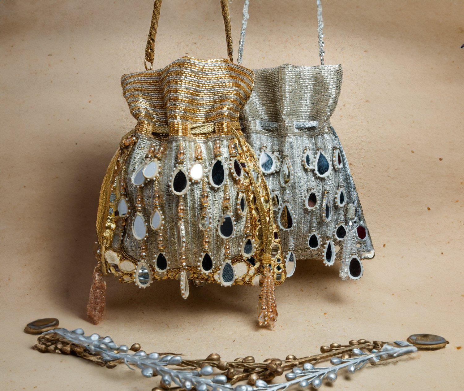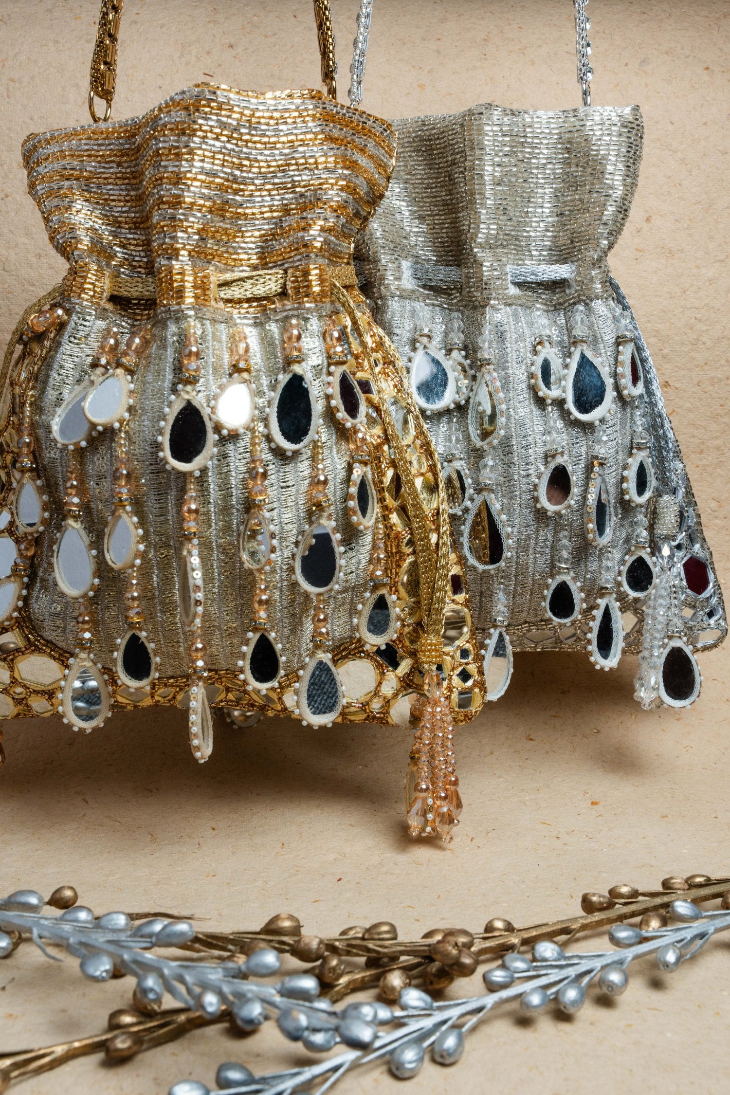 An exquisite fusion of tradition and elegance. This potli features a captivating mix of shimmering mirrors, delicate beads, and detailed abla work in a silver palette. Accented with luxurious pearl finishing and playful tassels, this potli is designed to add a touch of sparkle and sophistication to any special occasion.