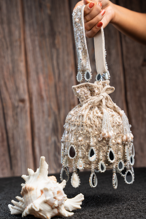 A stunning fusion of tradition and style, this ivory-based potli is adorned with beads and mirrors that create a vibrant, eye-catching design. Accented with playful tassels, it’s perfect for adding a colorful sparkle and elegant flair to any special occasion.