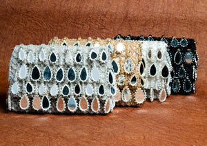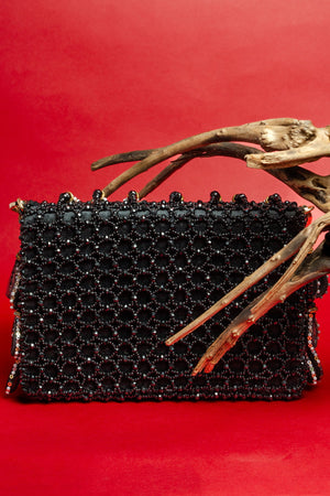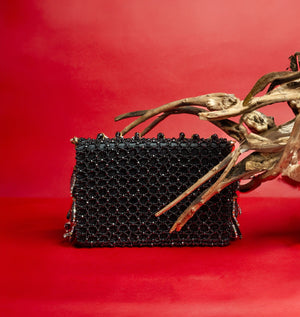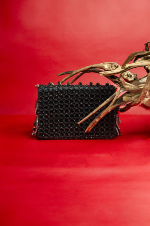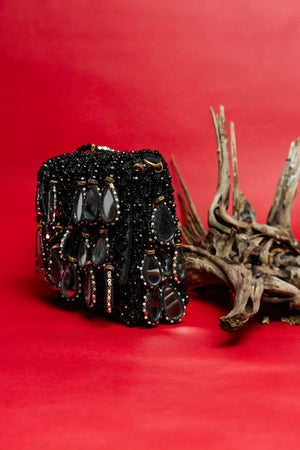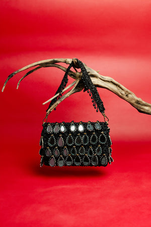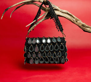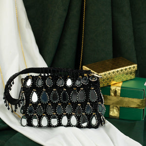 A stunning blend of tradition and elegance. This box-shaped potli is adorned with sparkling mirrors, delicate pearls, and intricate bead work, all in a sophisticated noir hue. The black finishing adds a luxurious touch, while the tassels bring a playful yet elegant flair. Perfect for special occasions, this potli is designed to catch the light and elevate your ensemble.