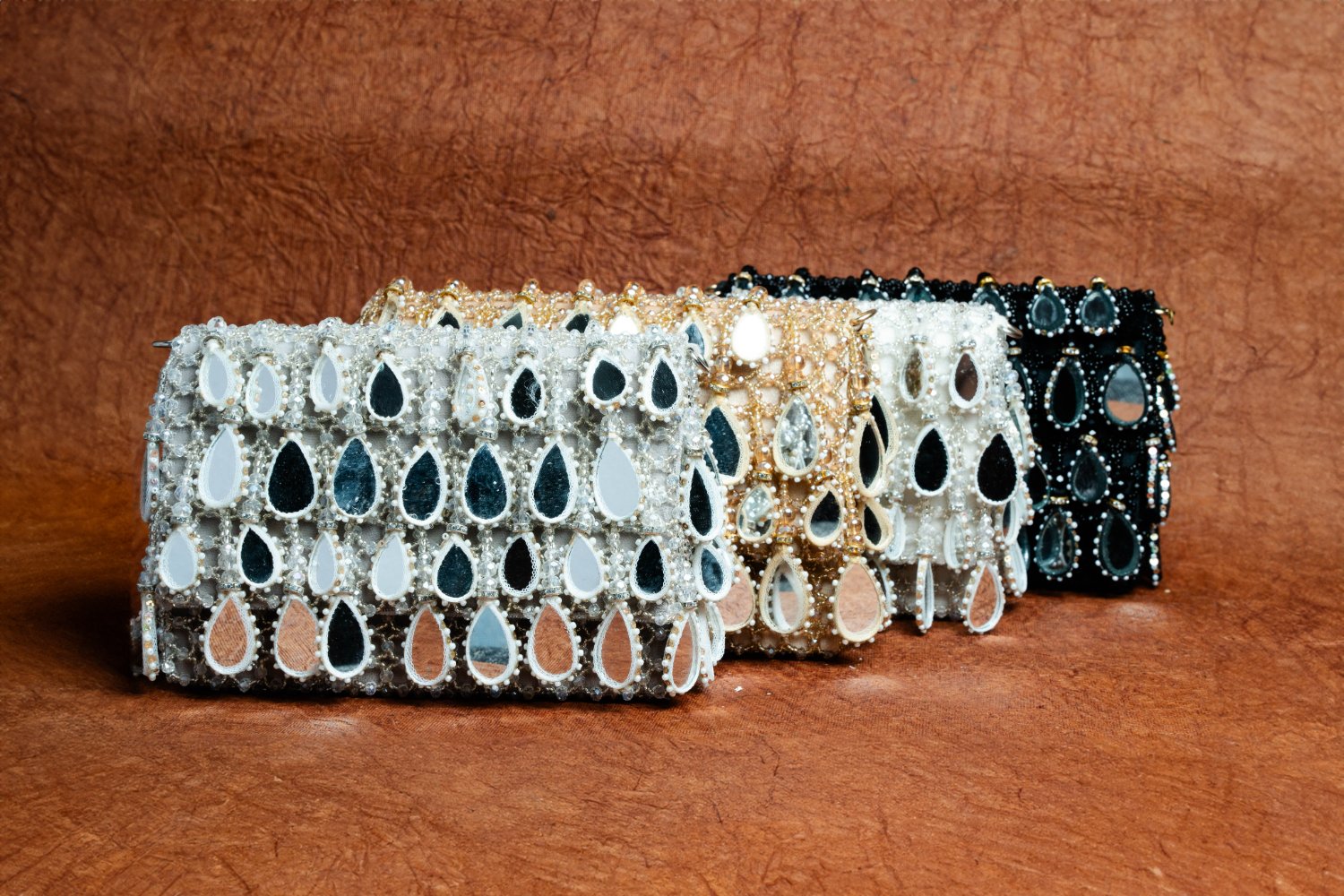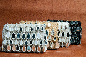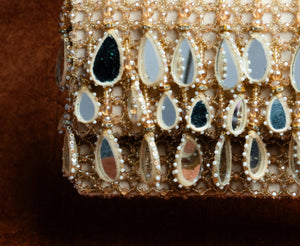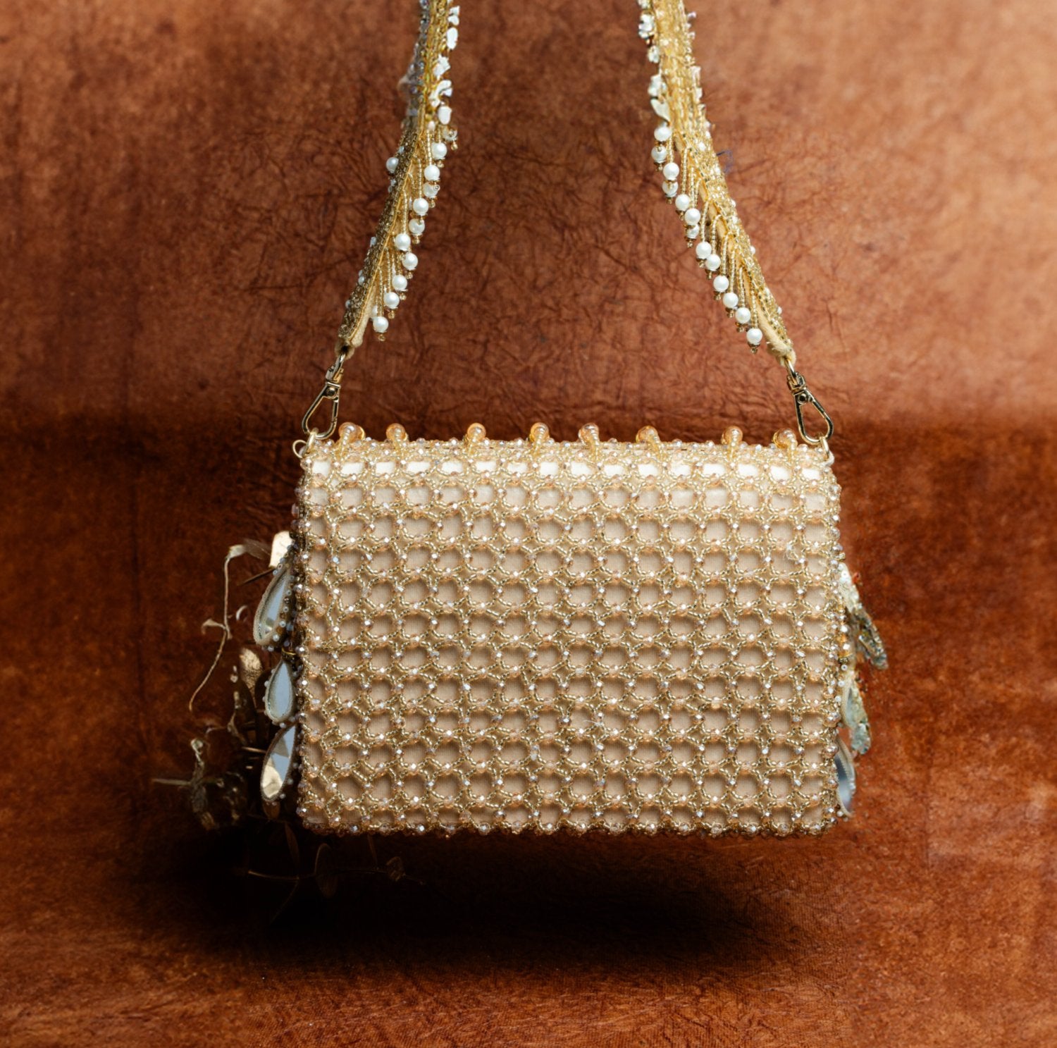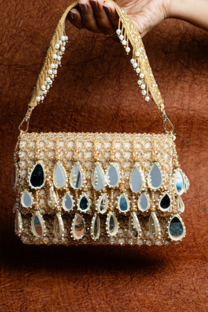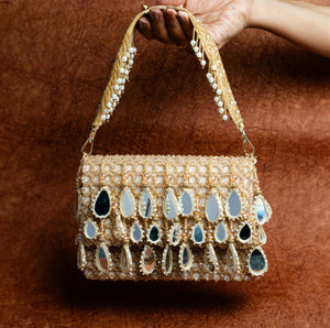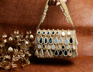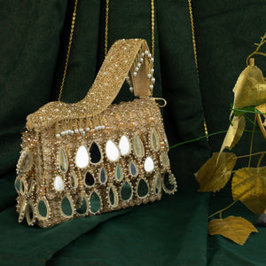 A stunning blend of tradition and elegance. This box-shaped potli is adorned with sparkling mirrors, delicate pearls, and intricate bead work, all in a sophisticated golden hue. The gold finishing adds a luxurious touch, while the tassels bring a playful yet elegant flair. Perfect for special occasions, this potli is designed to catch the light and elevate your ensemble.