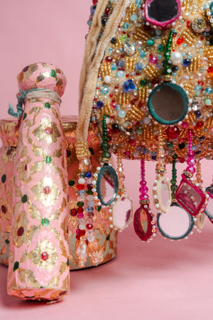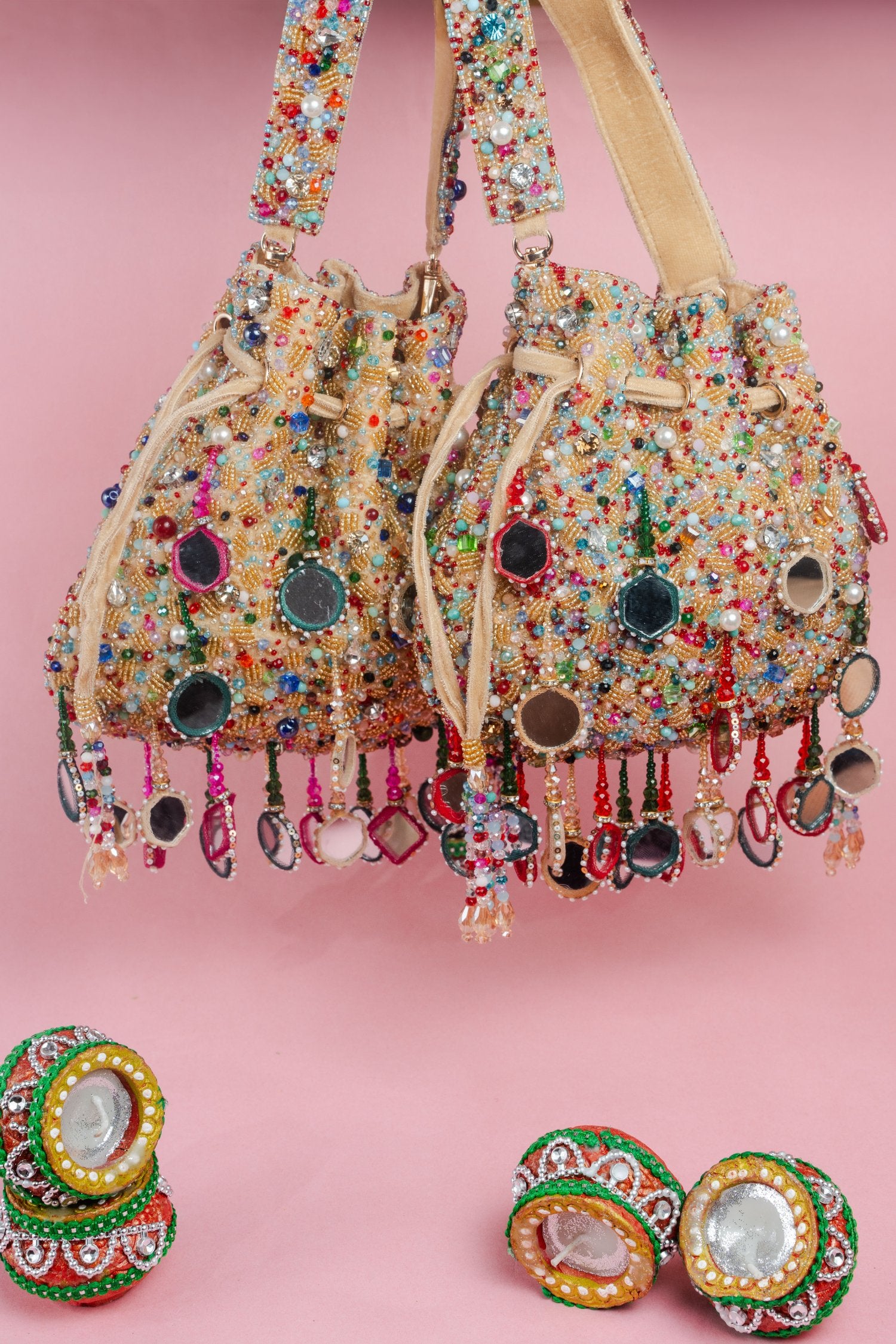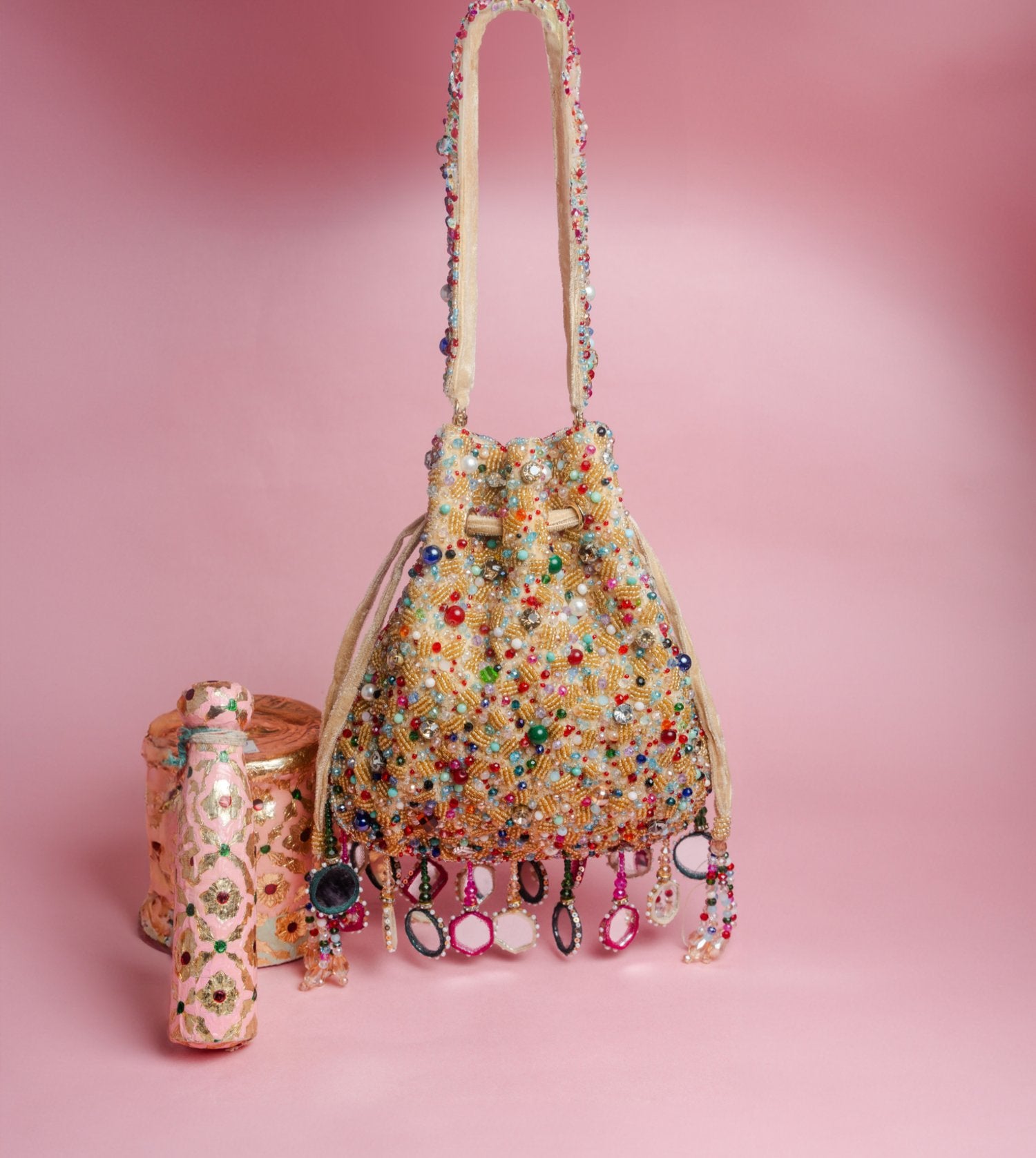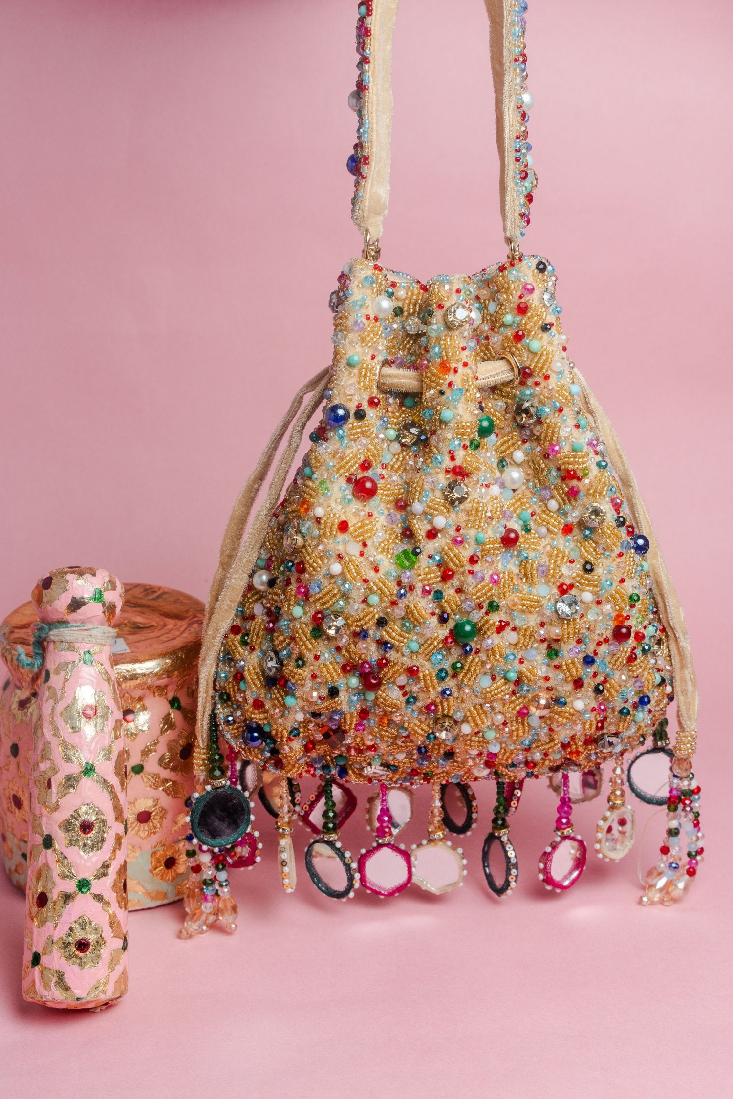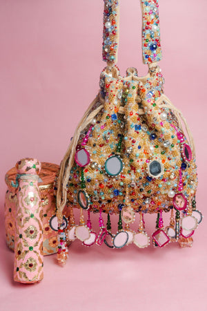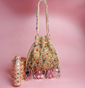 A stunning fusion of tradition and style, this gold-based potli is adorned with multi-colored beads and mirrors that create a vibrant, eye-catching design. Accented with playful tassels, it’s perfect for adding a colorful sparkle and elegant flair to any special occasion.