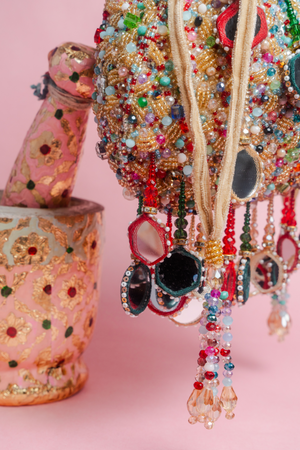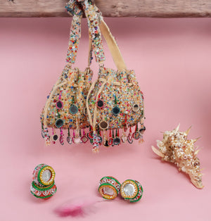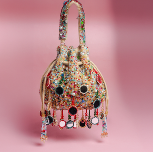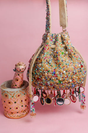 A stunning fusion of tradition and style, this gold-based potli is adorned with multi-colored beads and mirrors that create a vibrant, eye-catching design. Accented with playful tassels, it’s perfect for adding a colorful sparkle and elegant flair to any special occasion.