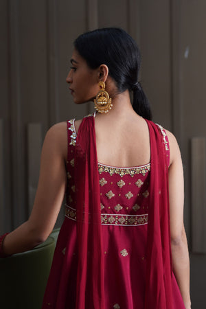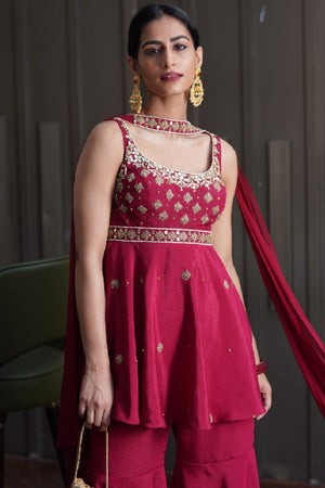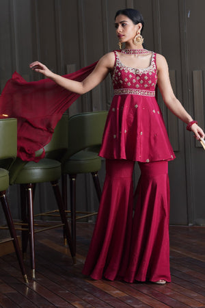 Maroon hand embroidered chiffon peplum kurta with chiffon sharara pants and georgette choker dupatta.