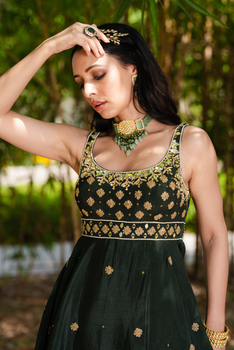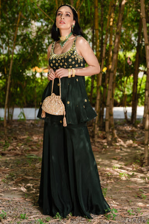 Dark Green Peplum Kurta paired with Chiffon Sharara Pants and Chiffon Choker Dupatta.