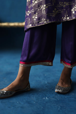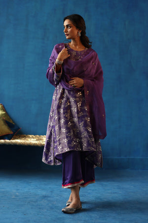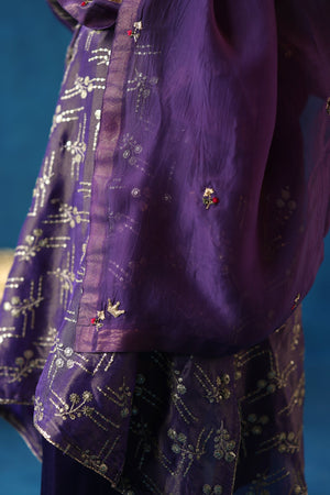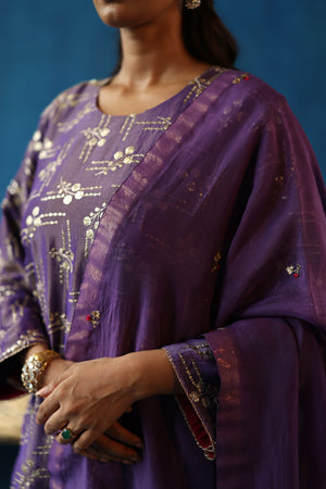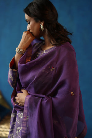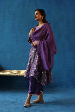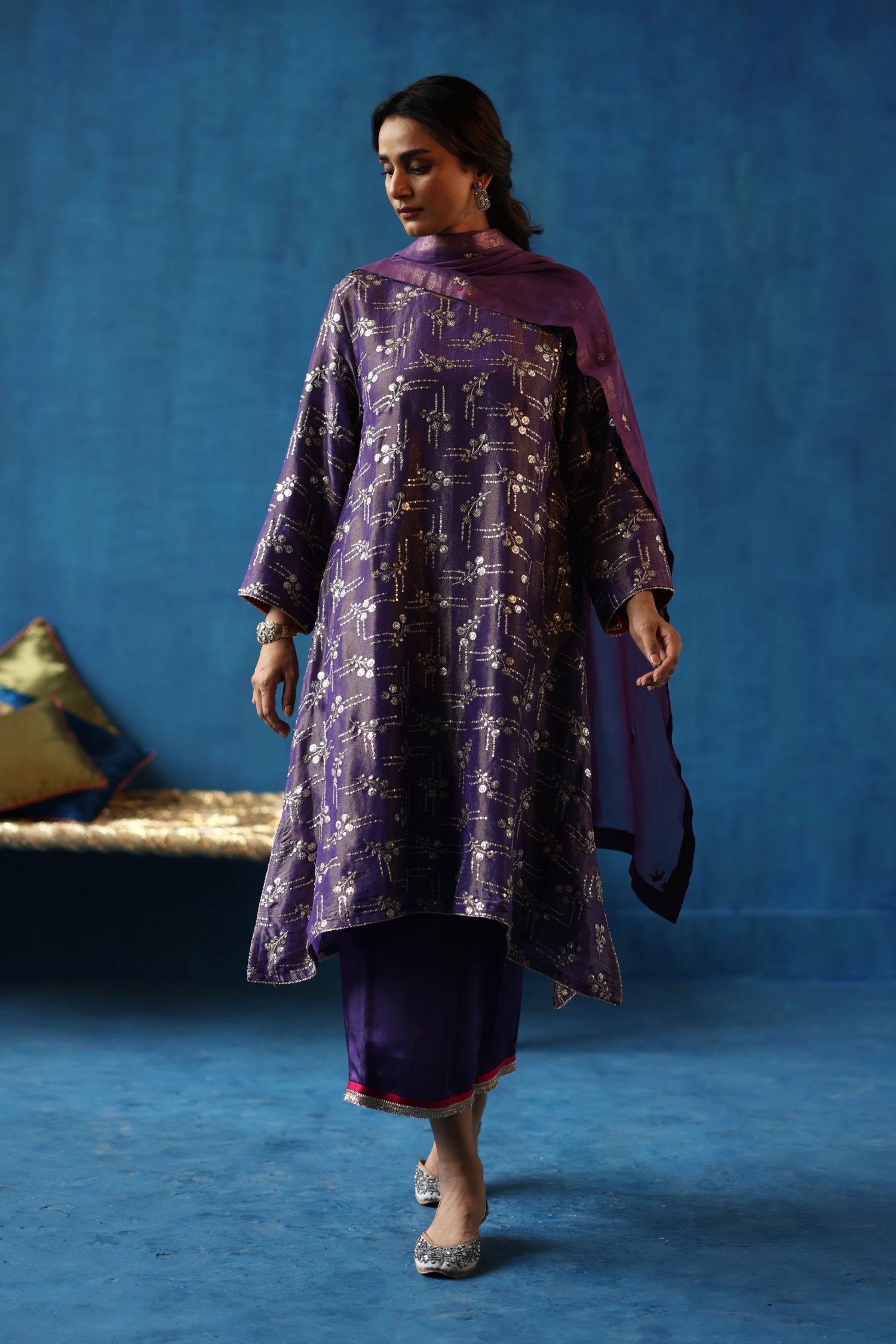 Zari silk kurta set with intricate silk tissue sequin works on the kurta. Paired with elegant satin pants and an organza dupatta adorned with delicate zari work. It's a perfect pick-me-up for an evening soiree.