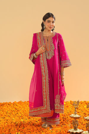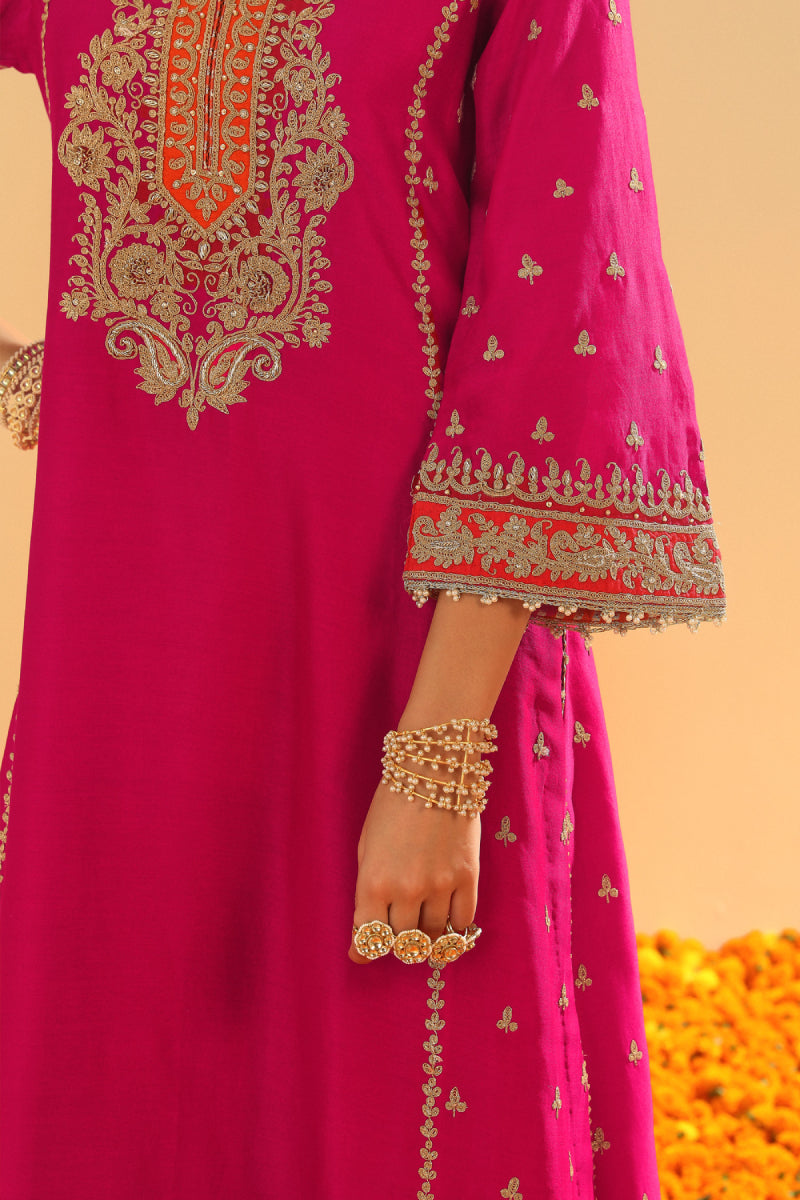 The long A-line ensemble is made in pure silk chanderi fabric teamed up with a palazzo and a silk organza dupatta. The outfit is having a zero neck with placket and three-quarter bell sleeves. The outfit is adorned with exquisite kirandori with sitaara and dabka zardozi. The outfit is finished with a contrast banarsi and kinari.