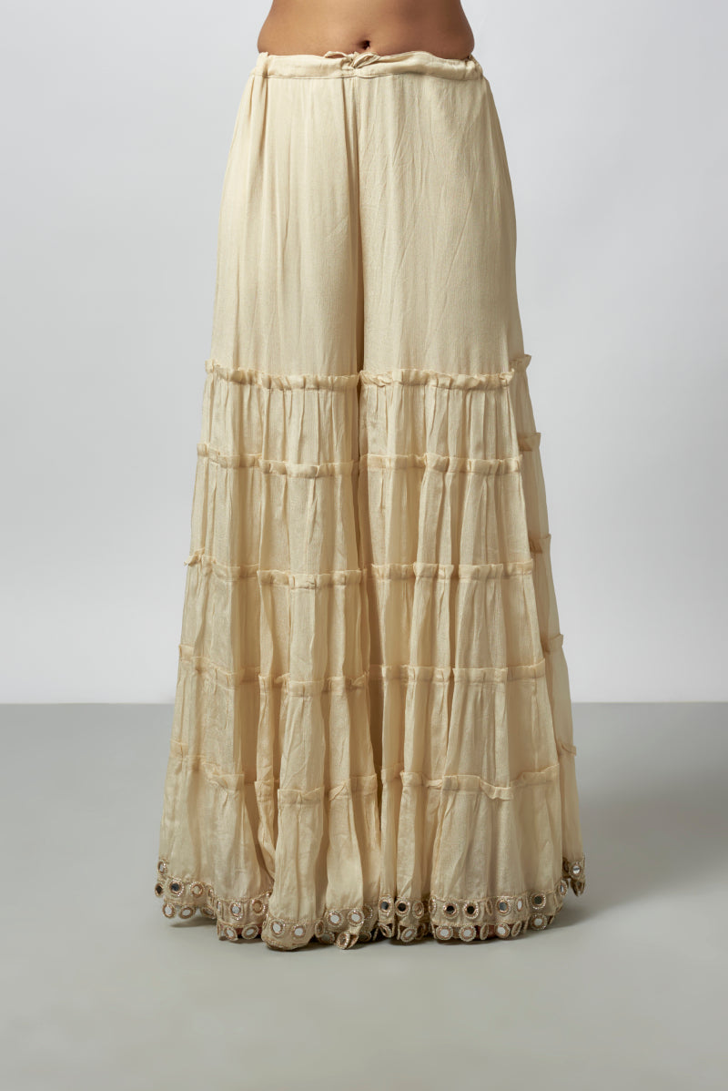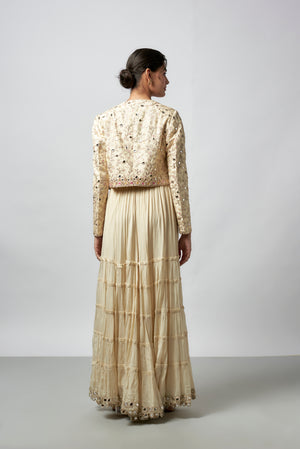 The outfit features a crop top intricately hand embroidered, complementing the top is a flowing sharara with soft gathers and full sleeved jacket embellished with mirror details, jaal work and hand touch up with vibrant thread work along the edges