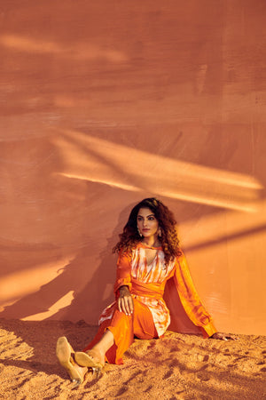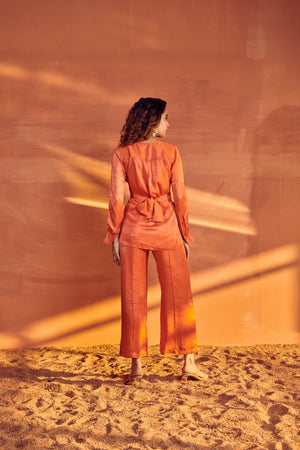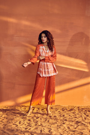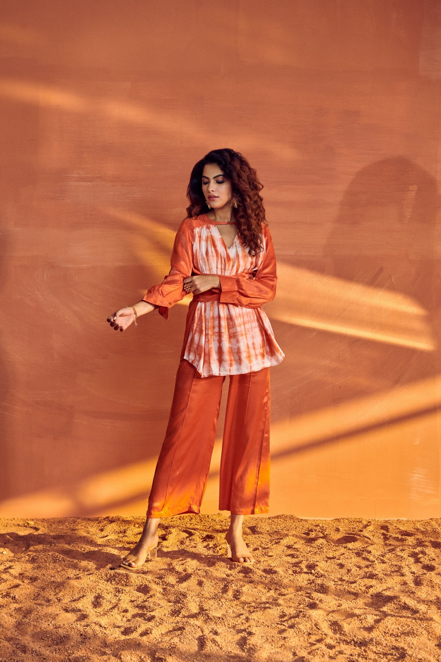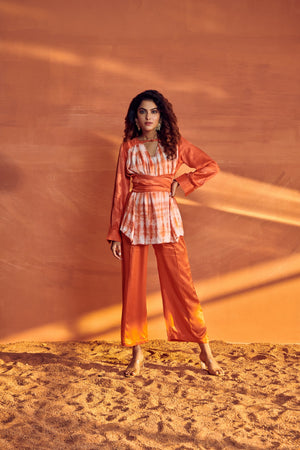 Elevate your style game with the Aapti Co-ord Set, in a captivating palette of rusty orange and white strokes. The edgy tie-dye design adds a modern flair to this ensemble, featuring a front-pleated top with pintuck pants for an extra touch of elegance.