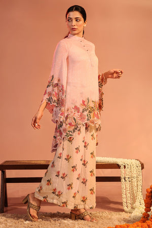 Pink Aarani Sequin Printed Shirt with Cutwork Hem paired with Pants in georgette.