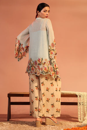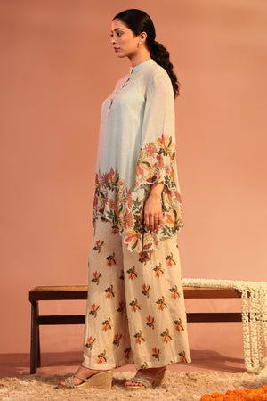 Blue Aarani Sequin Printed Shirt with Cutwork Hem paired with Pants in georgette.