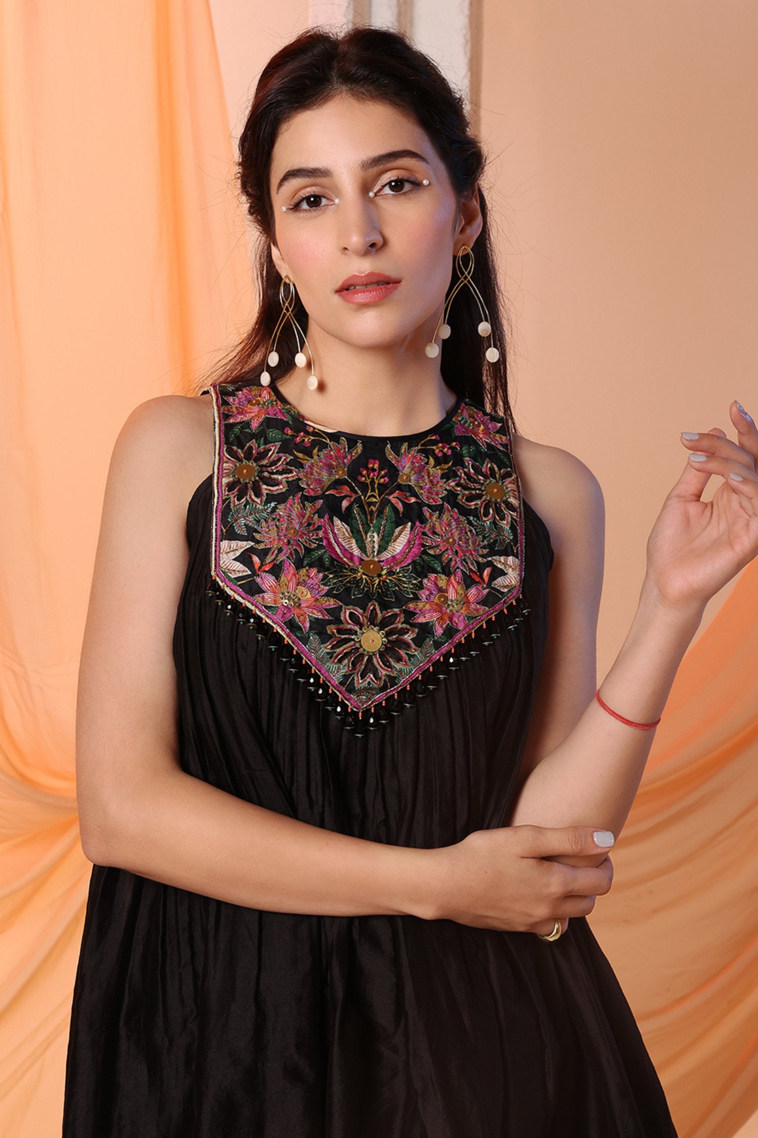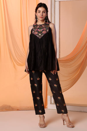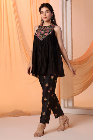 Black Aarani Gathered Top with Embroidered Neck Yoke in Chanderi, Paired with Printed Malaysian Silk Pants.