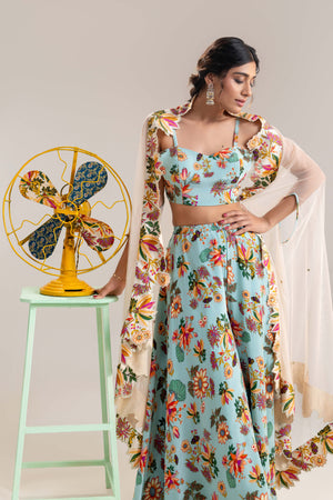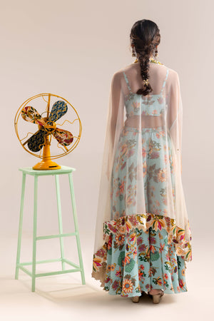 Blue Aarani printed bustier and pants in crepe, paired with an embroidered cape in net.