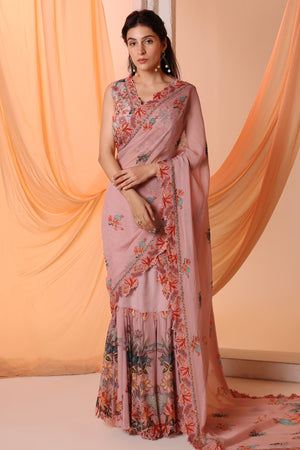 Pink Aarani embroidered pre-stitched saree with cutwork hem, paired with a cutwork neckline sleeveless blouse in cotton silk.