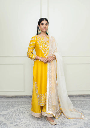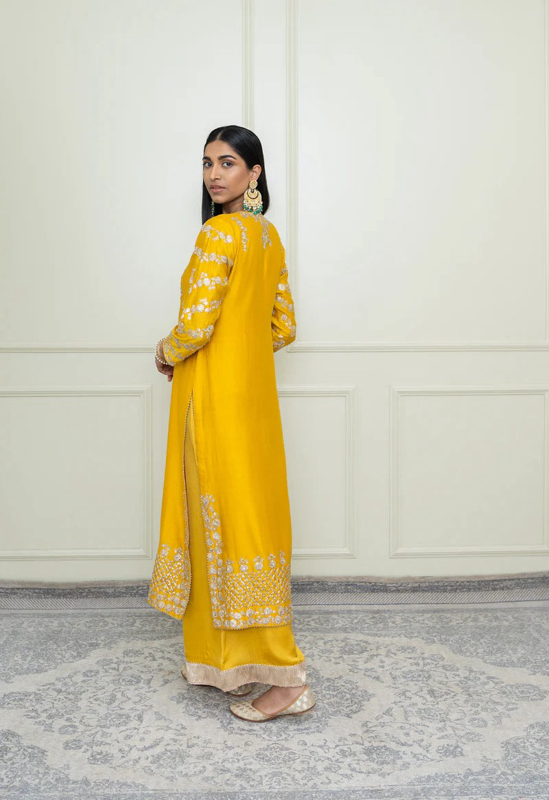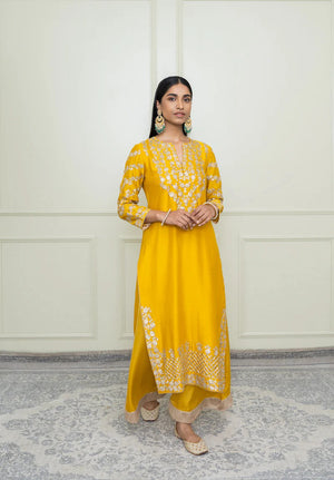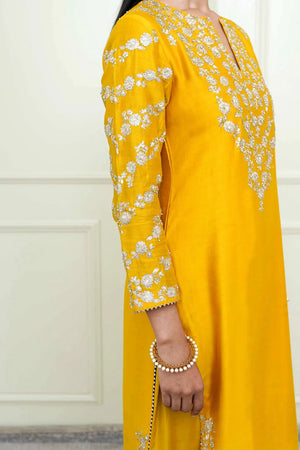 This ensemble features our signature Kashmiri Tilla embroidery. It features a zero neck with a slit & three-quarter sleeves. The embroidery is highlighted with very fine ivory pearls. The technique is an age-old tradition & one shall cherished it forever. The outfit is finished using a contrasting chanderi silk banarsi fabric and gota.