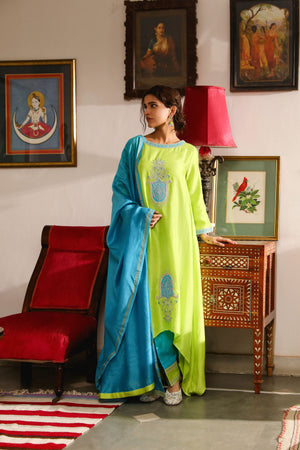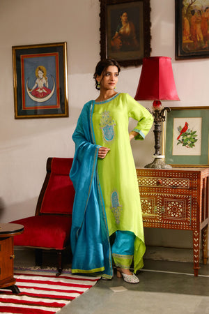 The radiant green hue is consciously chosen to complement various skin tones, making it a versatile and flattering choice for any event. Asymmetric kurta with salwar pants and silk chanderi dupatta is a perfect festive fit. Aarya kurta set offers distinctively beautiful patch and zari embroidery crafted on relaxed kaftan style kurta.