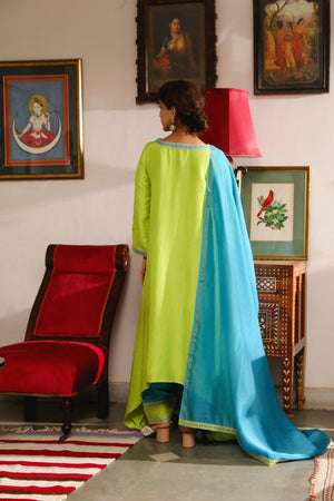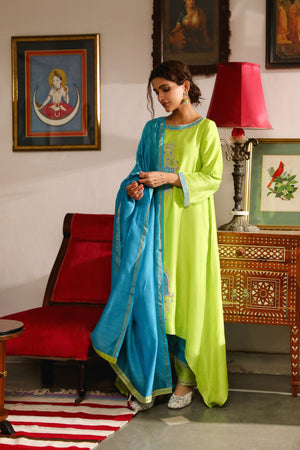 Vibrant green embroidered asymmetric kurta with contrasting salwar pants and dupatta
