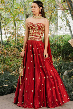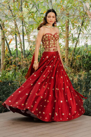 Maroon Georgette Corset Paired with Cotton Silk Lehenga and Georgette Choker Dupatta.