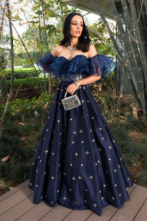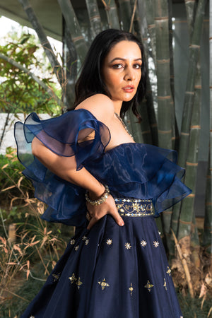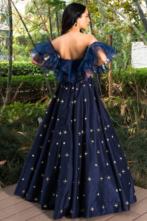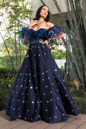 Navy Corset Cotton Silk Gown with embroidery and Silk Organza ruffle detail.