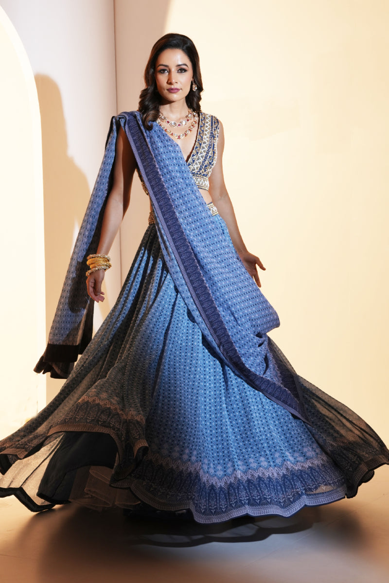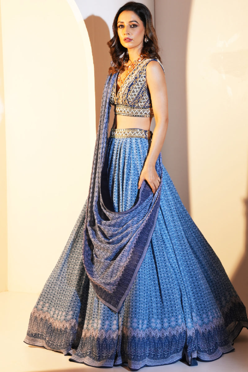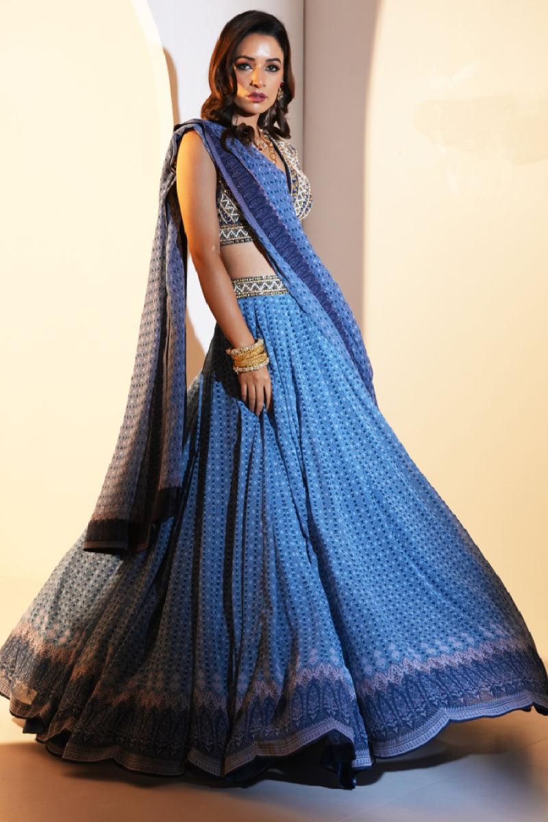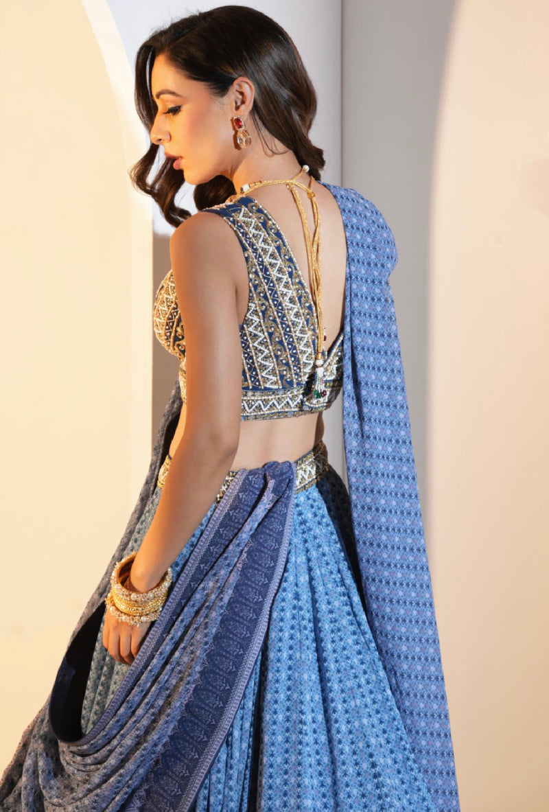 Blue georgette print lehenga with hand embroidered georgette blouse and georgette printed dupatta.