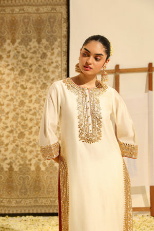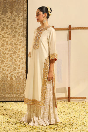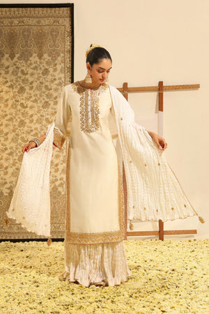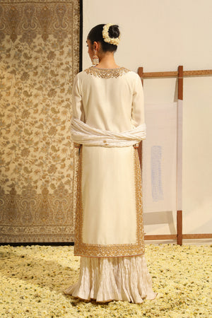 The Abbas ensemble showcases intricate hand work on a long straight kurta in pure Silk Chanderi fabric. This luxurious and comfortable fabric is embellished with heritage Gota Patti and Dabka Zardozi Embroidery. It features a crushed silk skirt and crushed dupatta. The look comes together with a zero neck and a placket on the front, along with three-quarter sleeves. The dupatta is accented with booti's all over and the outfit is finished with an exclusive Chanderi Silk Banarsi Fabric.