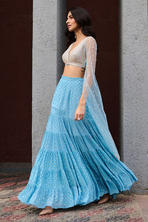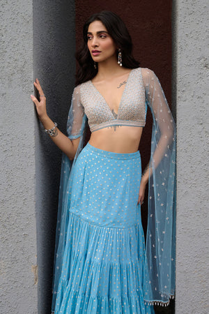 Blue fit and flared tiered georgette skirt paired with pearl and glassbeads work blouse with dramatic cape sleeves