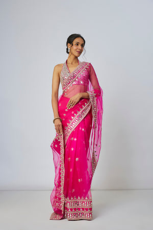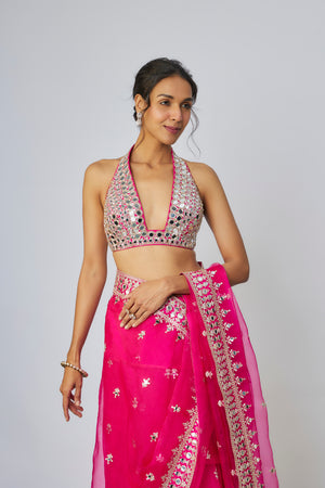 Featuring a captivating saree with delicate embroidery and mirror work. Accentuated with a broad, intricate border. The halter-neck blouse, embellished with heavy mirror detailing and floral hand embroidery. The sheer pallu, embroidered with scattered floral motifs, adds an element of elegance and sophistication.