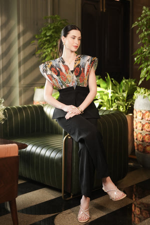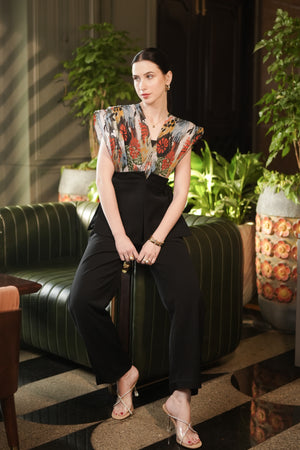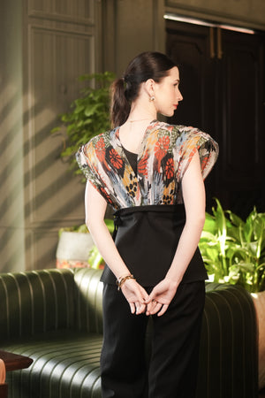 A chic abstract print sculpture top in black. This top combines modern artistry with a classic color, creating a bold and stylish look. abstract print with molded sculpture adds a touch of creativity and uniqueness to the top, making it a standout piece in any wardrobe. It's perfect for adding a touch of flair to your outfit while keeping it sleek and sophisticated.