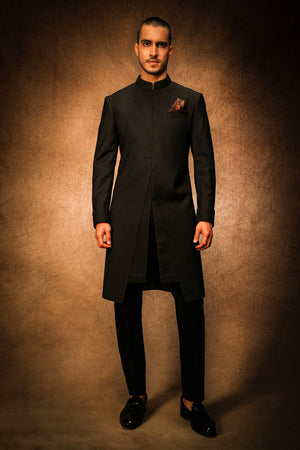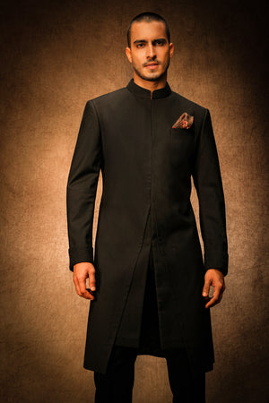 This Midnight Black V-Cut Achkan exudes timeless elegance with its premium craftsmanship. The refined front V-cut opening is the standout feature, giving it a distinctive and luxurious touch. Perfectly designed for high-end events, this achkan blends classic style with modern flair.